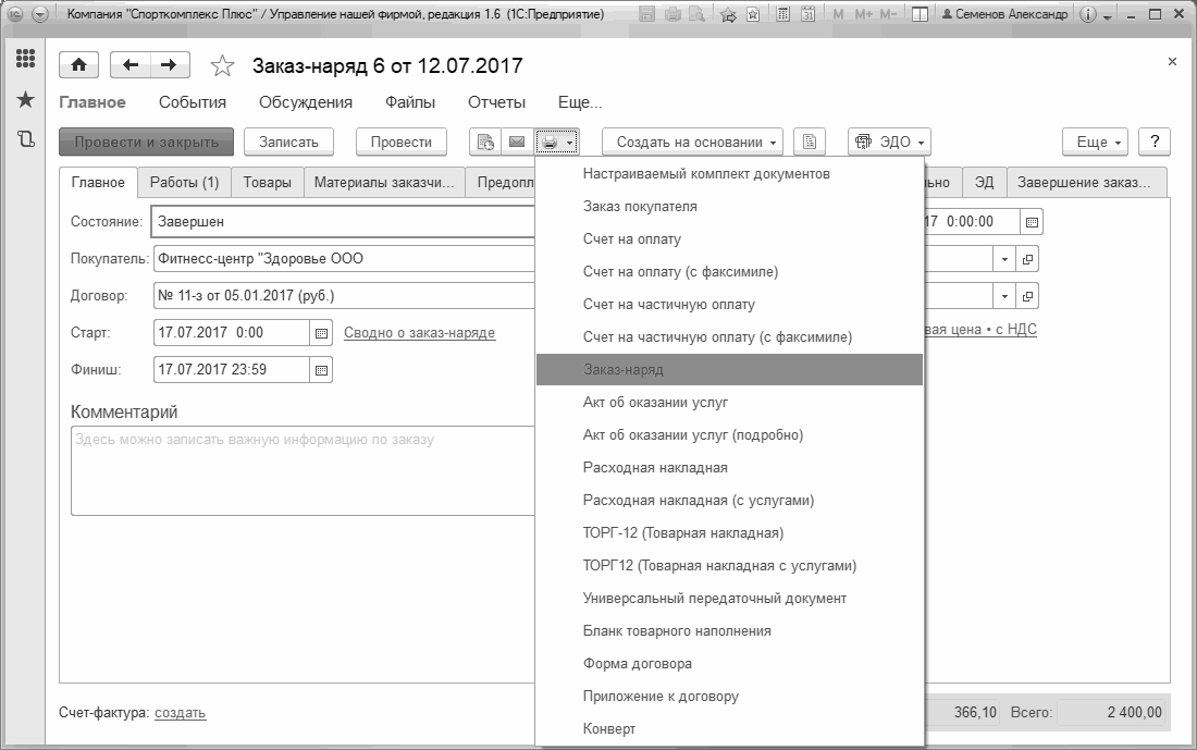 Открываем документ "Заказ-наряд", проверяем, все ли верно заполнено, не забываем при этом указать в табличной части фактический (а не плановый) объем работ, меняем состояние заказа на "Завершен", готовим для заказчика печатную форму документа.
