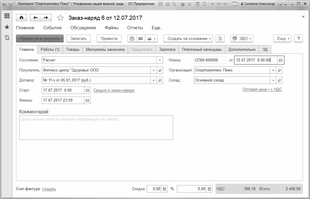 Рис. 102. "Заказ-наряд" в состоянии заказа "Расчет"