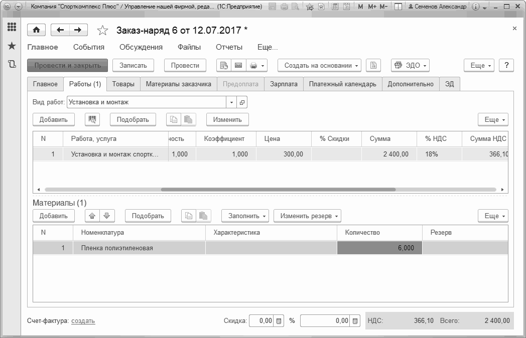 Отметим, что табличные части "Материалы" и "Зарплата" доступны для заполнения, если заказ-наряд оформляется именно на работы, а не на услуги. Для услуг возможность указания материалов и зарплаты исполнителей отсутствует.