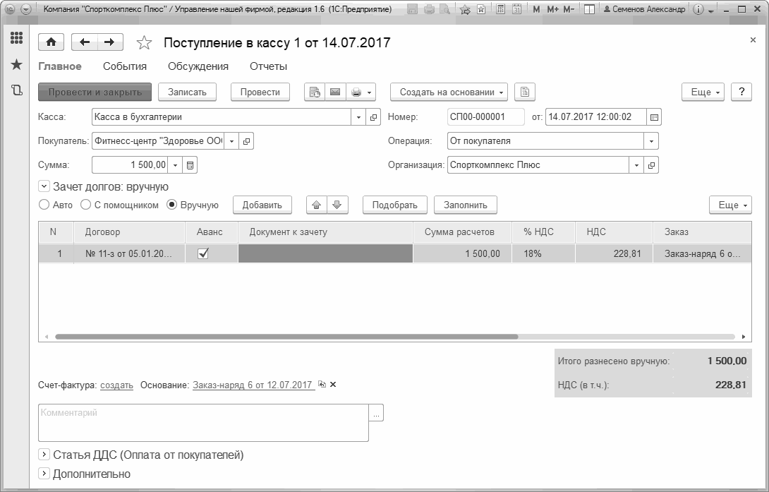 Остается только принять в кассу остаток долга по заказу документом "Поступление в кассу", убедиться, что заказ полностью оплачен и выполнен.