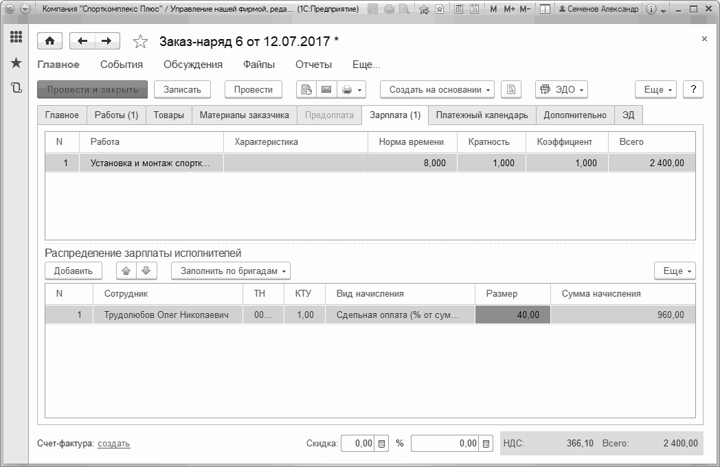 Рис. 105. Заработная плата исполнителей работ в документе "Заказ-наряд"
