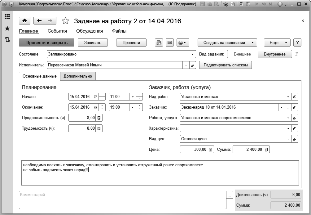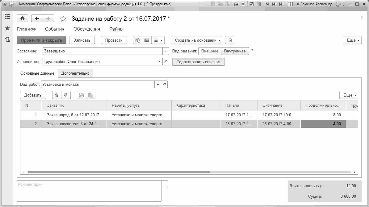 Напомним также, что документы "Задания на работу" помещаются в календари сотрудников-исполнителей. Эти возможности мы рассматривали ранее, когда изучали "Планирование и контроль действий по обращениям покупателей".