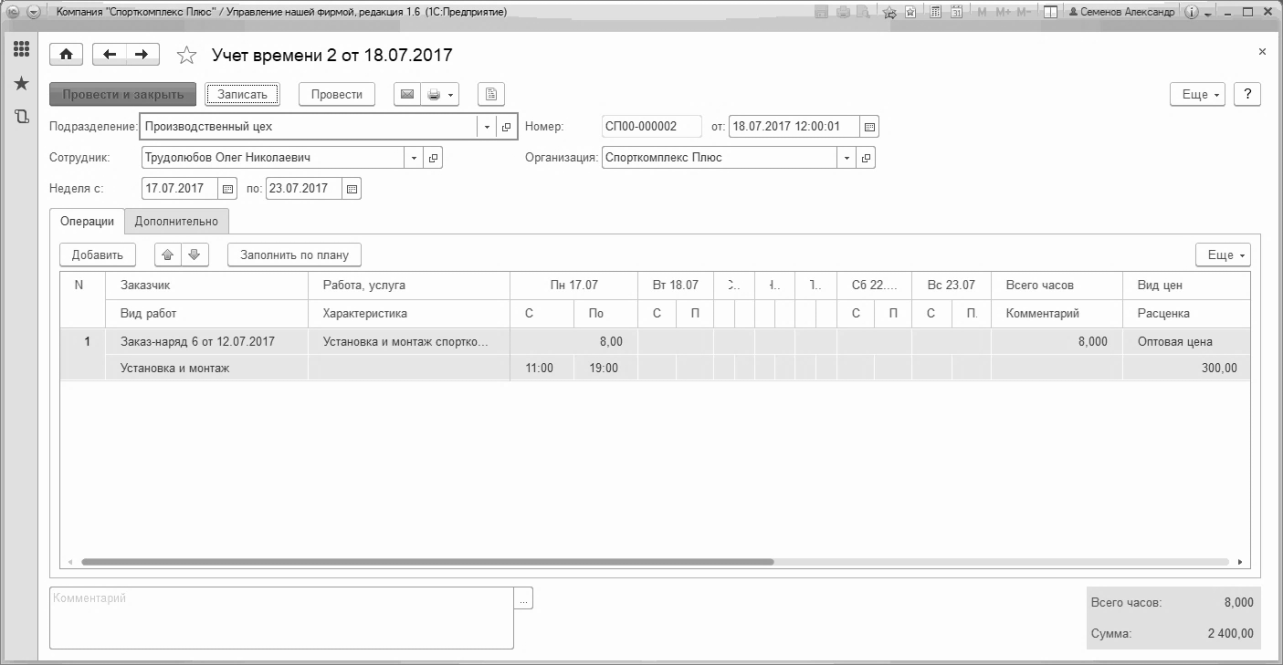 Факт выполнения работы исполнителем регистрируется с помощью документа "Учет времени" (Рис. 108), доступного в разделах "Работы" и "Производство".