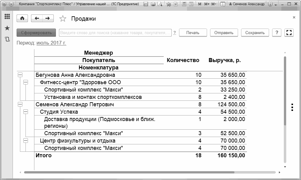 Рис. 118. Отчет "Продажи" в натуральном и стоимостном выражении, по менеджерам, ценовым группам и номенклатурным позициям, в порядке убывания суммы продаж