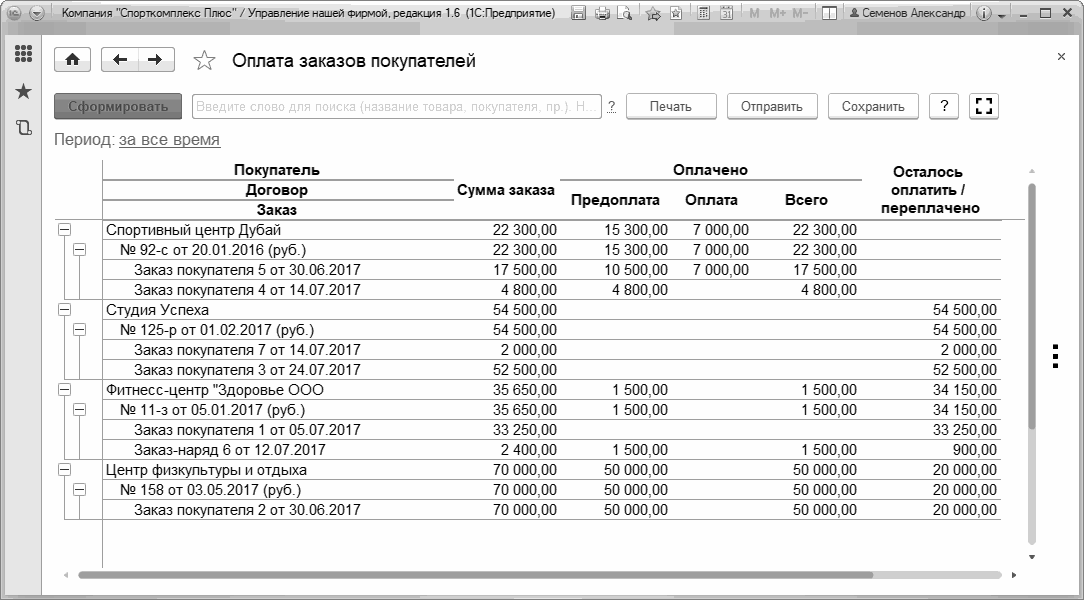 Рис. 119. Отчет "Анализ оплаты по заказам покупателей", сформированный по контрагентам, договорам и заказам