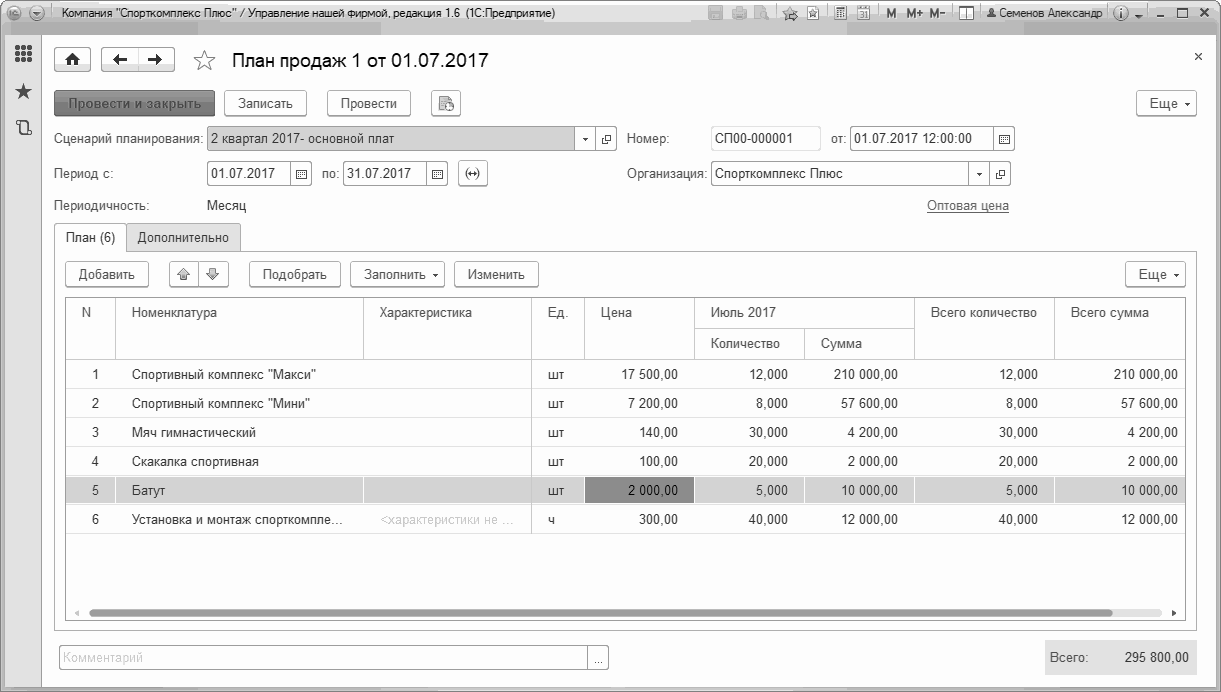 Документ "План продаж" позволяет вводить данные без учета характеристик, даже если они предусмотрены по той или иной номенклатурной позиции. Действительно, не всегда целесообразно, например, планировать продажи спортивных комплексов в разрезе цветовых гамм. Достаточно – в целом по номенклатурной позиции. В примере, показанном на Рис. 120, мы так и поступили – спланировали продажи спортинвентаря и комплексов, не детализируя по характеристикам.