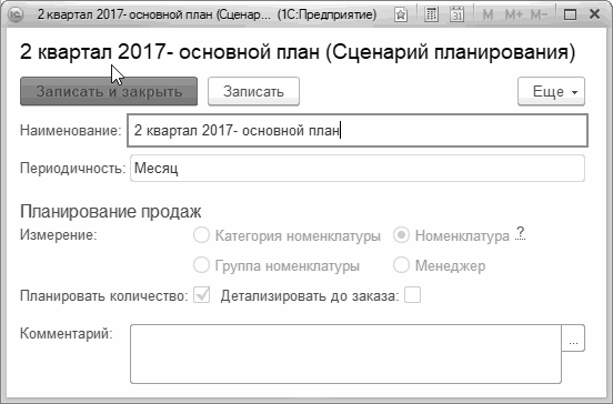 Для регистрации составленных планов продаж в программе "1С:Управление нашей фирмой" используется документ "План продаж" (Рис. 120), который позволяет ввести данные детализацией по номенклатурным единицам (включая разбивку по характеристикам), а также заказам покупателей.