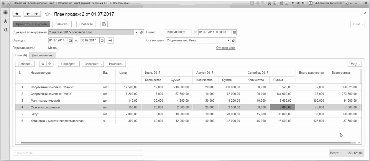 В табличной части документа необходимо вручную указывать все номенклатурные позиции и планируемые объемы продаж в натуральном выражении. Суммы продаж и НДС рассчитываются автоматически – по типу цен, указанному здесь же в документе (в примере на рисунке – Оптовая цена).