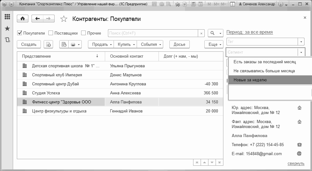 Под сегментами понимаются группы покупателей, выделенные по каким-либо признакам: принадлежности к определенному региону, виду деятельности, размеру, дате последнего взаимодействия, менеджеру, объему продаж и так далее. В программе "1С:Управление нашей фирмой 8" сегментирование реализовано в виде справочника который представляет собой пополняемый набор определенных заранее отборов которыми можно воспользоваться из списка контрагентов. Например, выбрав покупателей, не совершивших покупок в течение месяца можно подготовить список к обзвону или для массовой рассылки.