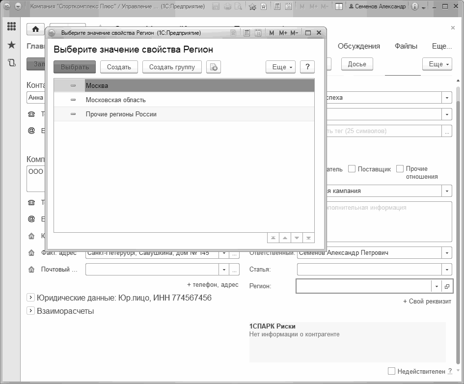 Рис. 130. "Регион" как дополнительный реквизит в карточке контрагента