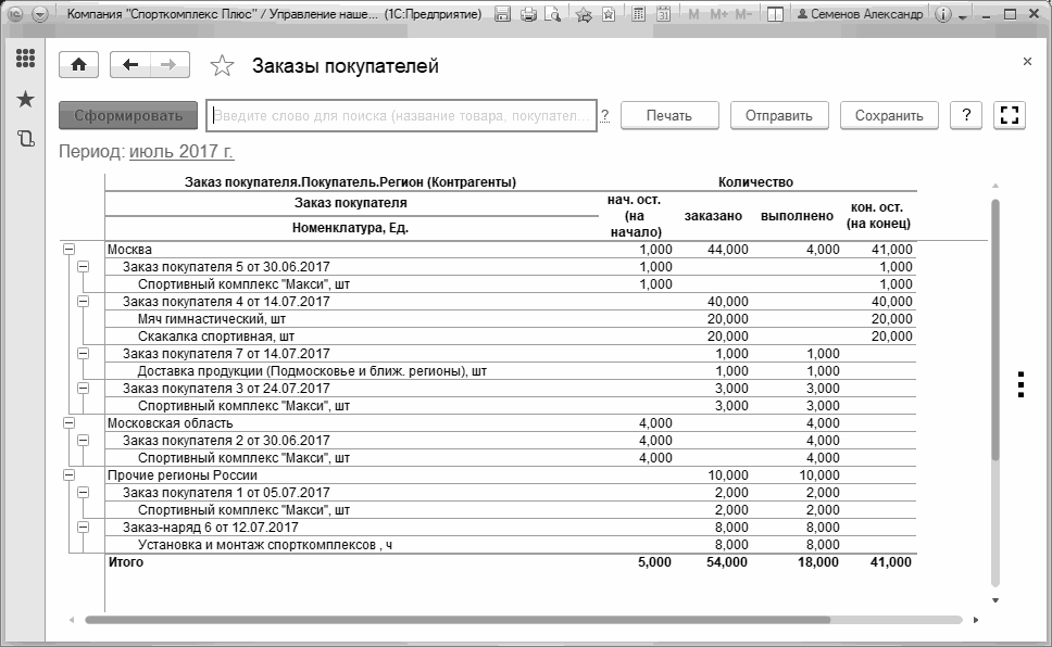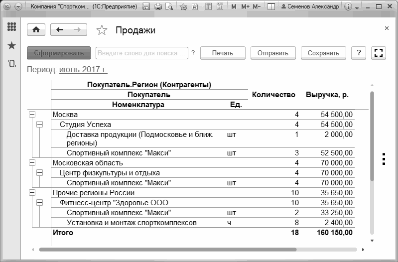 На Рис. 133 показан еще один интересный пример - отчет "Продажи", группировки которого заданы таким образом, чтобы получить данные о покупателях спортивных комплексов в разрезе различных регионов.