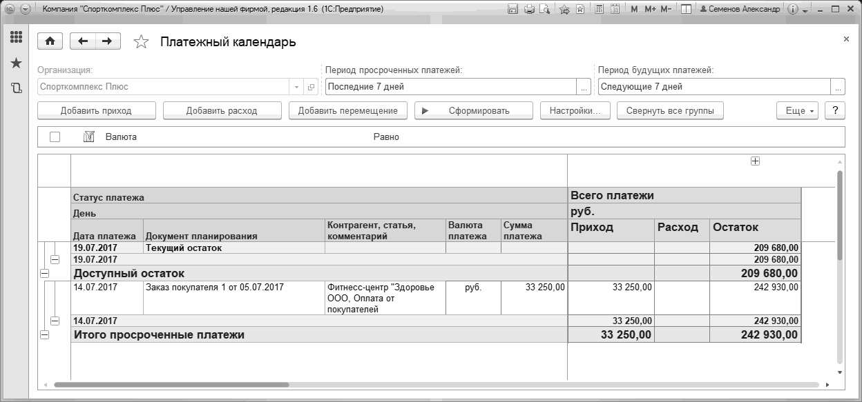 Обратимся к Рис. 181, на котором представлен пример платежного календаря за 19 июля 2017 года. Очевидно, что у нас есть просроченные платежи – 33 2500 рублей должны были поступить на расчетный счет еще 14-го числа.