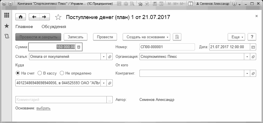 Рис. 182. Документ "Поступление денег (план)"