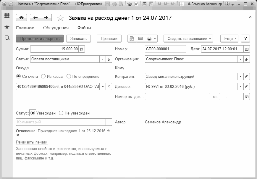 Рис. 183. Документ "Заявка на расход денег"