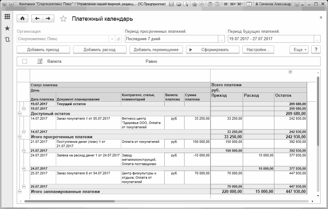 Рис. 181. Пример платежного календаря за 19.07.2017