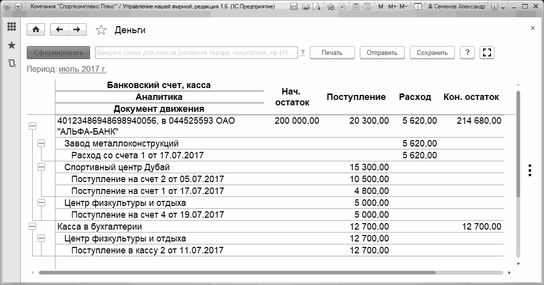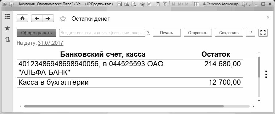 Рис. 186. Отчет "Деньги" в варианте "Остатки"