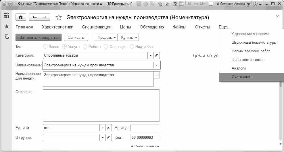 Рис. 193. Счет учета затрат в карточке номенклатуры "Электроэнергия на нужды производства"