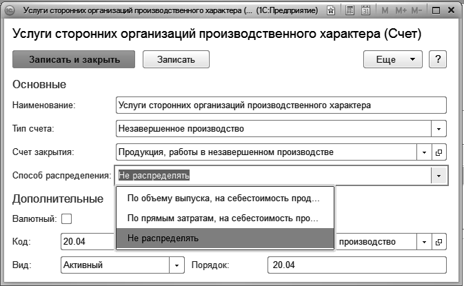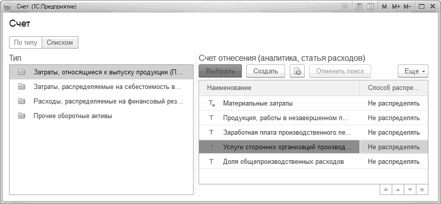Рис. 199. Выбор способа распределения для счета типа "Незавершенное производство"