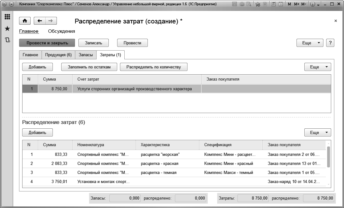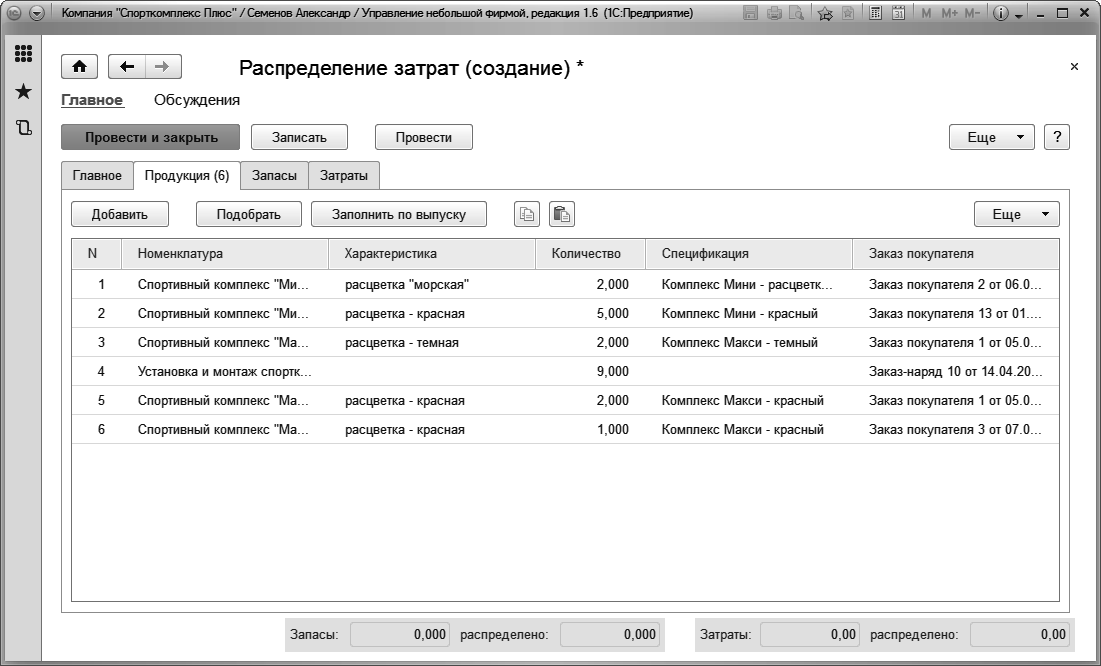 Рис. 196. Документ "Распределение затрат", вкладка "Продукция"
