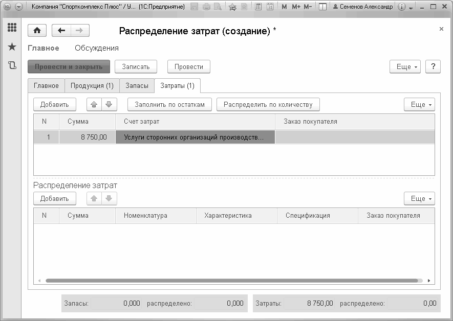 Рис. 197. Документ "Распределение затрат", кнопка "Заполнить по остаткам"
