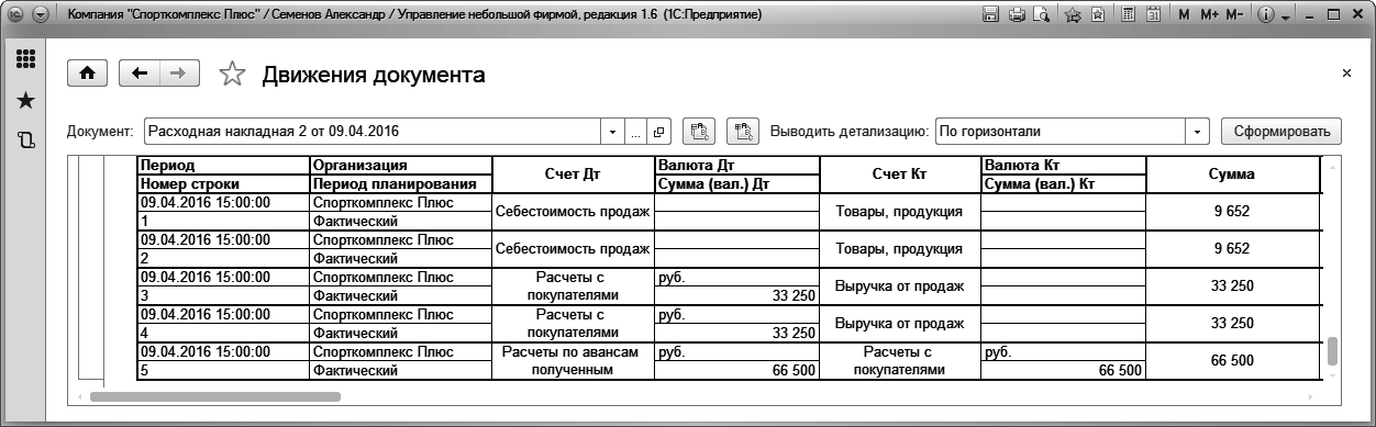 Записи по счетам плана счетов (проводки) делаются программой автоматически при проведении документов. Для этого используется Регистр бухгалтерии "Управленческий". Проводки, сформированные документом, можно посмотреть, перейдя по ссылке "Отчет по движениям" в форме документа. См. Рис. 218.