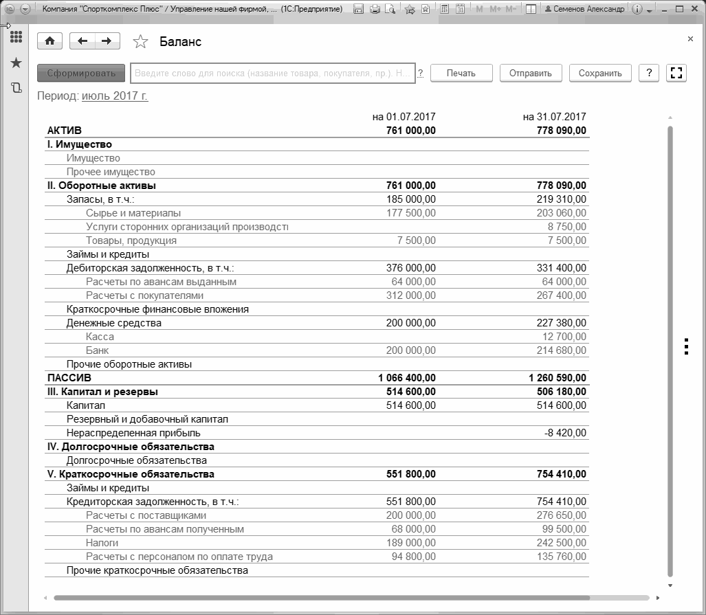 Как видно из Рис. 220, управленческий баланс в программе "1С:Управление нашей фирмой 8" имеет традиционную общепринятую форму.