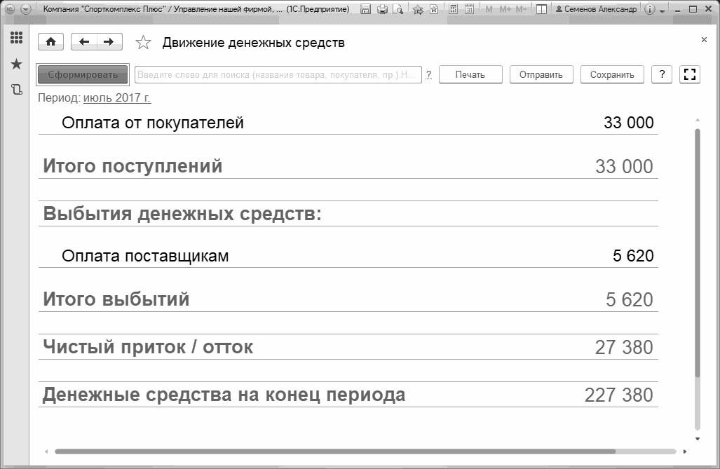 Отчет показывает остатки денежных средств на начало и на конец периода, поступления и выбытия денежных средств – постатейно, а также – чистый приток/отток денежных средств, рассчитываемый как разница между суммой поступлений и суммой выбытий.