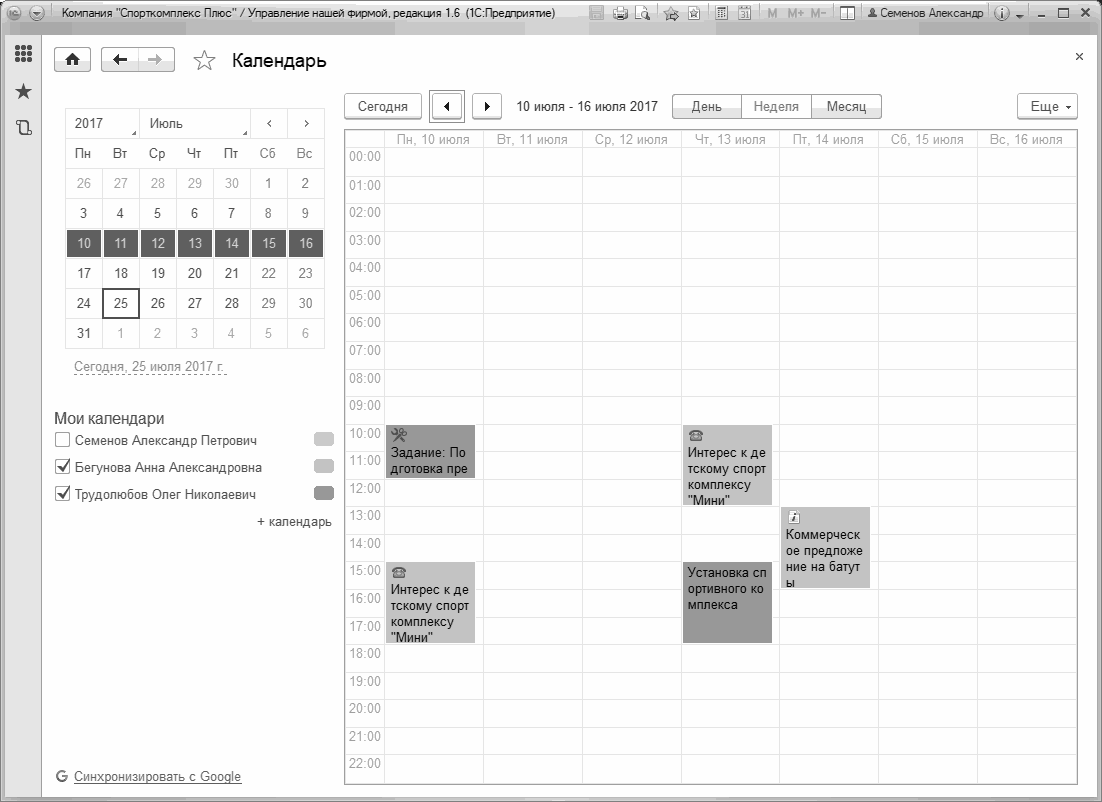 Для осуществления контроля загрузки персонала в программе существует форма "Календарь сотрудника". Календарь может быть просмотрен самим сотрудником, что помогает не забыть о полученных заданиях. Календарь может быть просмотрен и другим сотрудником – например, его руководителем, с целью контроля загрузки персонала. Он доступен на панели действий разделов "Главное" и "CRM".