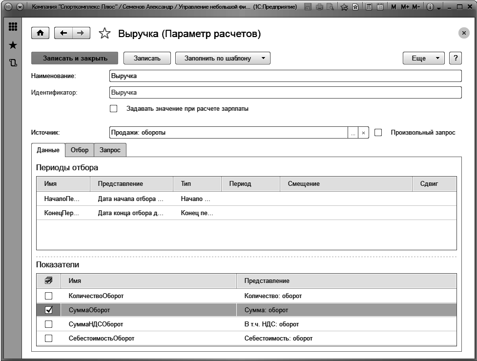 Рис. 247. Настройка выборки данных для параметра расчета "Выручка"