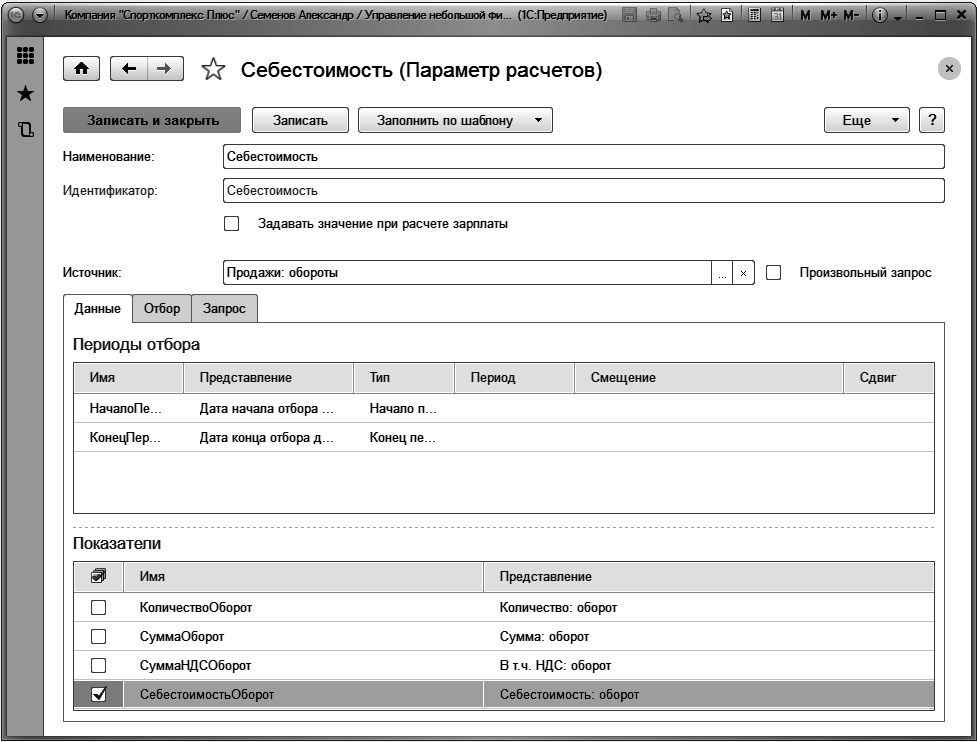Рис. 248. Настройка выборки данных для параметра расчетов "Себестоимость"