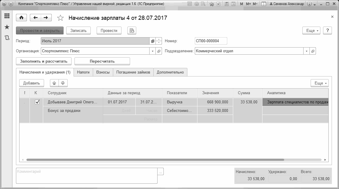 Вводим документ "Начисление зарплаты", заполняем реквизиты шапки (подразделение – коммерческий отдел) и нажимаем кнопку "Заполнить" (Рис. 250). Видим, что в табличной части появилась строка с видом начислений "Бонус за продажи", при этом произошел расчет значений показателей "Выручка" и "Себестоимость".