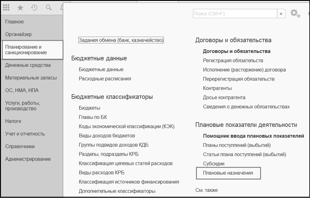 Список документов вида Плановые назначения можно открыть с помощью команды Плановые назначения меню функций раздела Планирование и санкционирование.