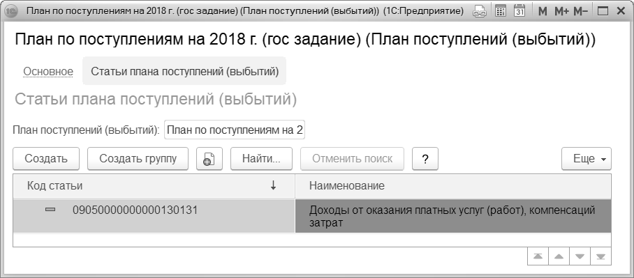 Так как справочник Статьи плана поступлений (выбытий) является подчиненным по отношению к справочнику Планы поступлений (выбытий), то для просмотра статей плана поступлений (выбытий) следует заполнить реквизит План поступлений (выбытий), выбрав необходимое значение из списка.