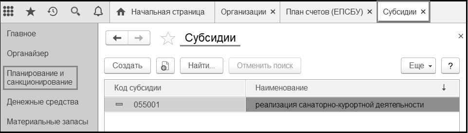 Перечень предоставленных учреждению субсидий хранится в справочнике Субсидии. Данный справочник содержит сведения о субсидиях: