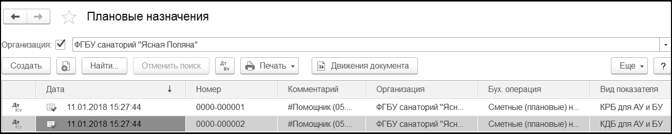 Регистрация плановых (прогнозных) показателей поступлений и выбытий выполняется документом Плановые назначения. Данный документ применяется также для последующей их корректировке.