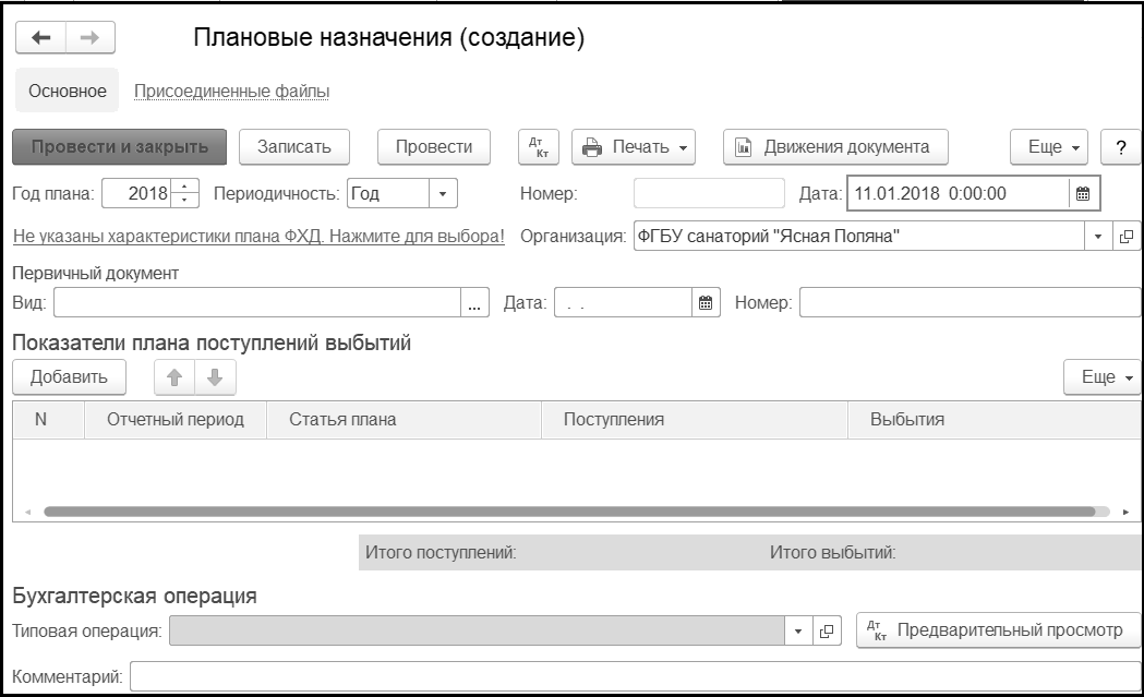В табличную часть документа вводятся данные о показателях плана поступлений (выбытий):