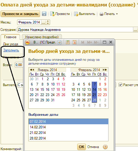 Сотруднице Дуровой Н.А. предоставлены четыре дня по уходу за детьми-инвалидами: 7, 14, 21 и 28 февраля, создадим документ "Оплата дней по уходу за детьми-инвалидами" и рассчитаем оплату за указанные дни в одном документе. Документ проведем.