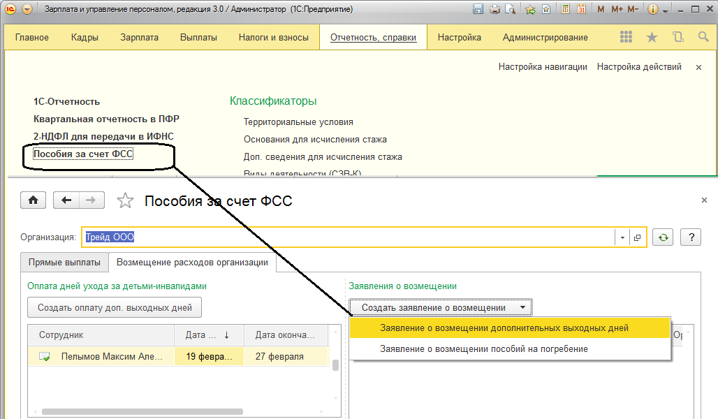 Напомним, что организации, которые участвуют в пилотном проекте ФСС по прямым выплатам, могут начислять пособия по уходу за детьми-инвалидами и социальные пособия на погребение, а затем подавать заявления на возмещение сумм из ФСС. Рассмотрим, как отразить данную ситуацию в программе.
