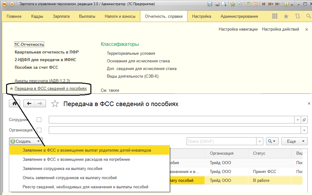 - В разделе «Отчетность, справки / Передача в ФСС сведений о пособиях».