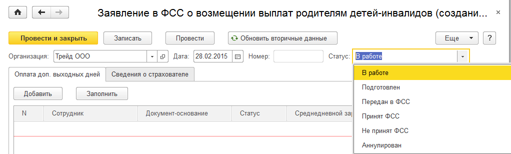 Документ можно заполнить автоматически по команде «Заполнить» всеми первичными документами, на которые еще не созданы заявления, либо вручную. На закладке «Оплата доп.выходных дней» заполняются сотрудники и информация из первичного документа о расчете сумм пособия. При этом необходимо уточнить статус сотрудника по отношению к ребенку-инвалиду.