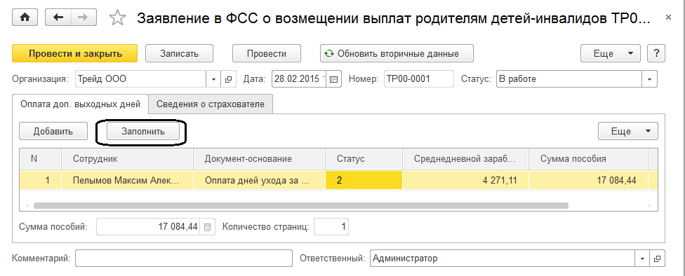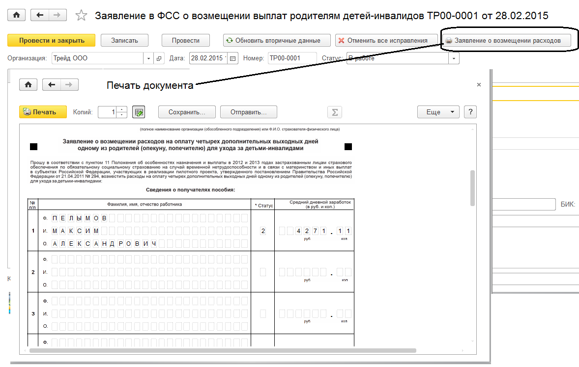 Для реализации данной задачи в программе предусмотрен документ «Заявление в ФСС о возмещении выплат родителям детей-инвалидов».