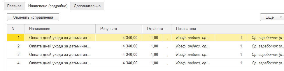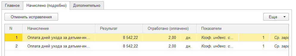 На закладке "Главное" указываются дни ухода за детьми-инвалидами. Поскольку таких дней в месяце может быть, то в документе существует возможность указать несколько дат в рамках месяца.