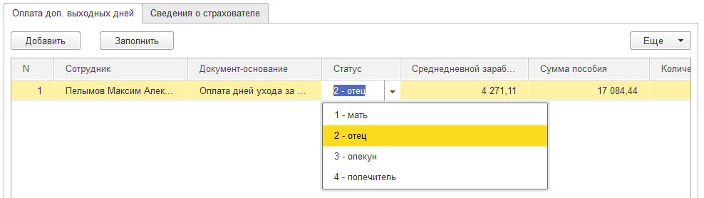 Документ можно заполнить автоматически по команде "Заполнить" всеми первичными документами, на которые еще не созданы заявления, либо вручную. На закладке "Оплата доп. выходных дней" заполняются сотрудники и информация из первичного документа о расчете сумм пособия. При этом необходимо уточнить статус сотрудника по отношению к ребенку-инвалиду.