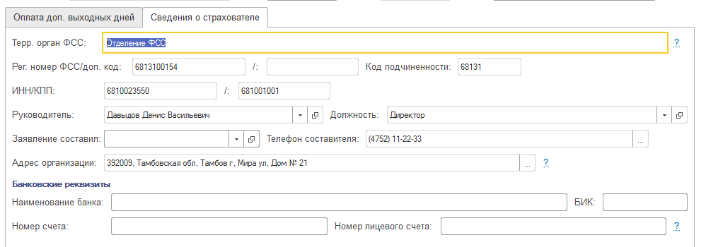 На закладке "Сведения о страхователе" заполняются сведения об организации.