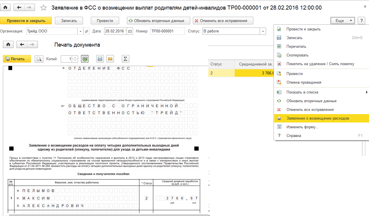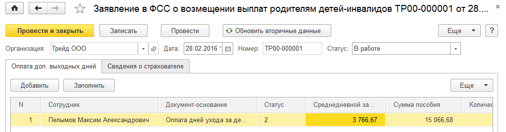 Для реализации данной задачи в программе предусмотрен документ "Заявление в ФСС о возмещении выплат родителям детей-инвалидов".