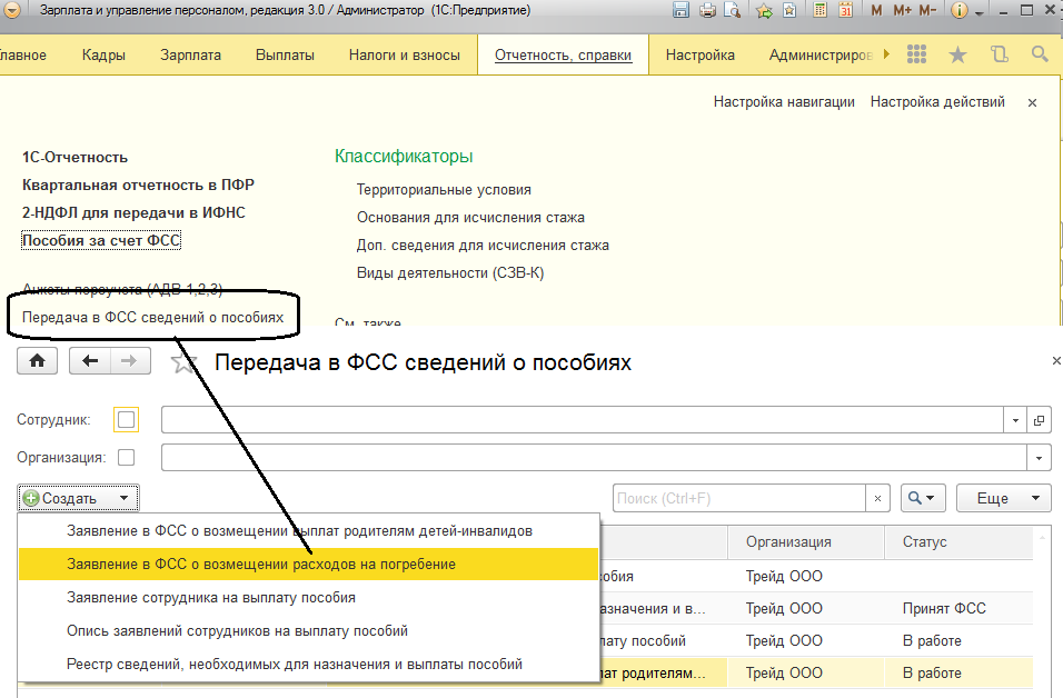 ·        В разделе "Отчетность, справки / Передача в ФСС сведений о пособиях".