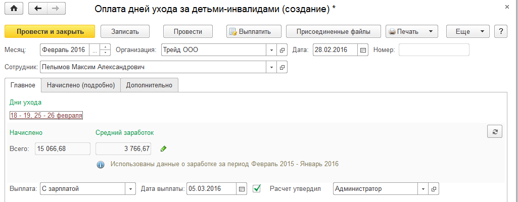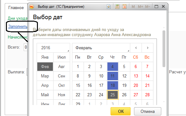 Сотруднику ООО "Трейд" Пелымову М.А. предоставлены четыре дня по уходу за детьми-инвалидами: 18, 19, 25 и 26 февраля. Из раздела "Зарплата/ Все начисления" создадим документ "Оплата дней по уходу за детьми-инвалидами". Заполним на закладке "Главное" указанные даты  (перейдем по ссылке "Заполнить" и кликнем на нужные числа два раза левой клавишей мыши). Оплата будет рассчитана автоматически за все указанные дни в одном документе.