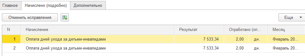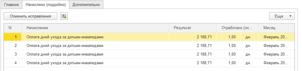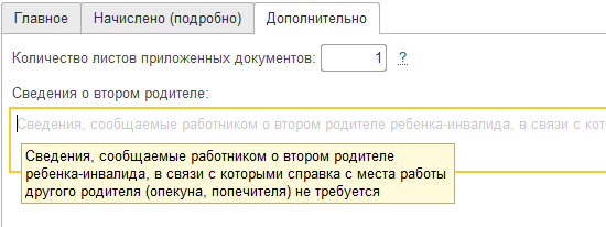 На закладке "Главное" указываются дни ухода за детьми-инвалидами. Поскольку таких дней в месяце может быть, то в документе существует возможность указать несколько дат в рамках месяца.