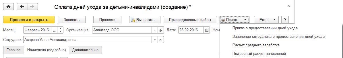 Из формы документа можно вывести на печать приказ о предоставлении дополнительных выходных дней и расчет среднего заработка.