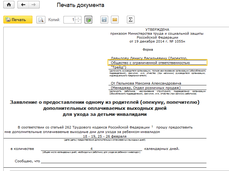 Документ проведем. Выведем на печать заявление сотрудника о предоставлении дней ухода.